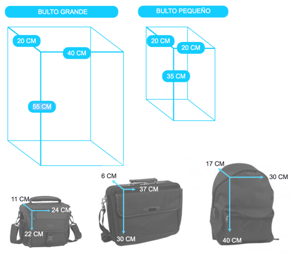 El grande (el que irá a la bodega si no se paga) es una maleta de mano, con medidas de 55cm x 40cm x 20cm. El pequeño (siempre permitido en cabina), es un bolso, una mochila escolar pequeña o, por ejemplo, la bolsa de una cámara de fotos reflex, ya que el límite marcado es de 35cm x 20cm x 20cm.