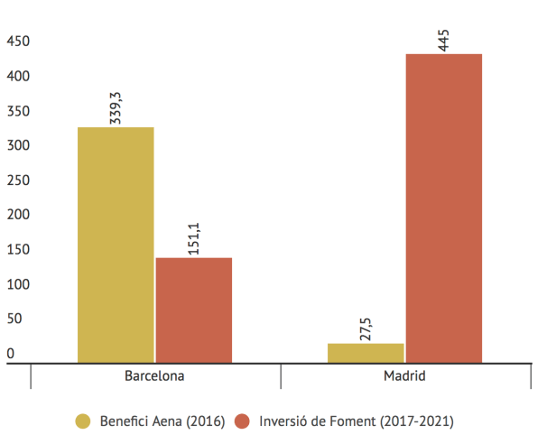 A partir de los datos de resultados de Aena y la planificación del Documento de Regulación Aeroportuaria (Dora) para el periodo 2017-2021, el estudio revela una realidad demoledora: el aeropuerto de Barcelona aporta el 55% de los beneficios y recibe el 7% de las nuevas inversiones mientras que el de Madrid sólo representa el 4% de las ganancias a pesar de percibir el 20% de la inversión.